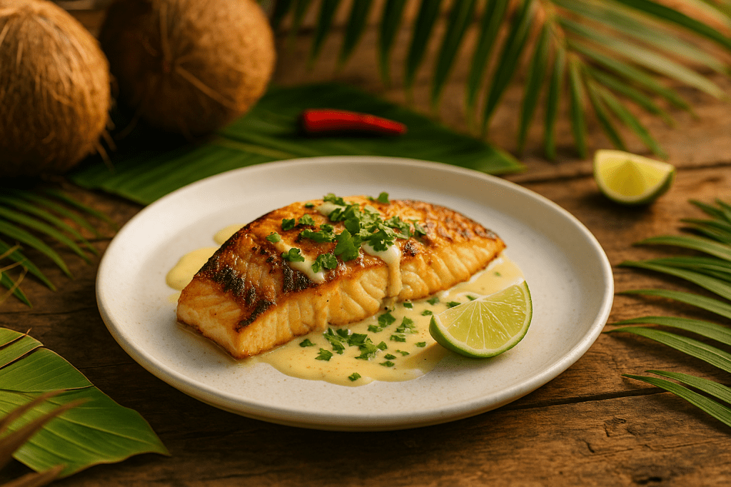 - Main: Grilled fish or tofu with coconut-lime sauce